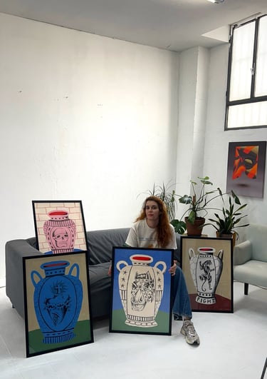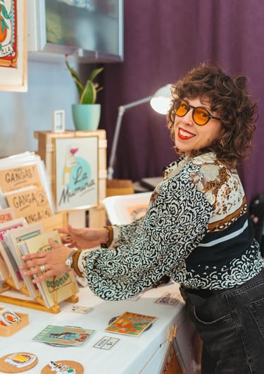 Una pintora sevillana que estudió Bellas Artes en la universidad de Sevilla, especializándose ya en esos años en ilustración infantil y talleres de creatividad. Hace diez años, se dedica a pintar cuadros, ilustraciones, carteles, textiles… se podría considerar una artista polifacética, pero prefiere pensar que está siempre jugando.